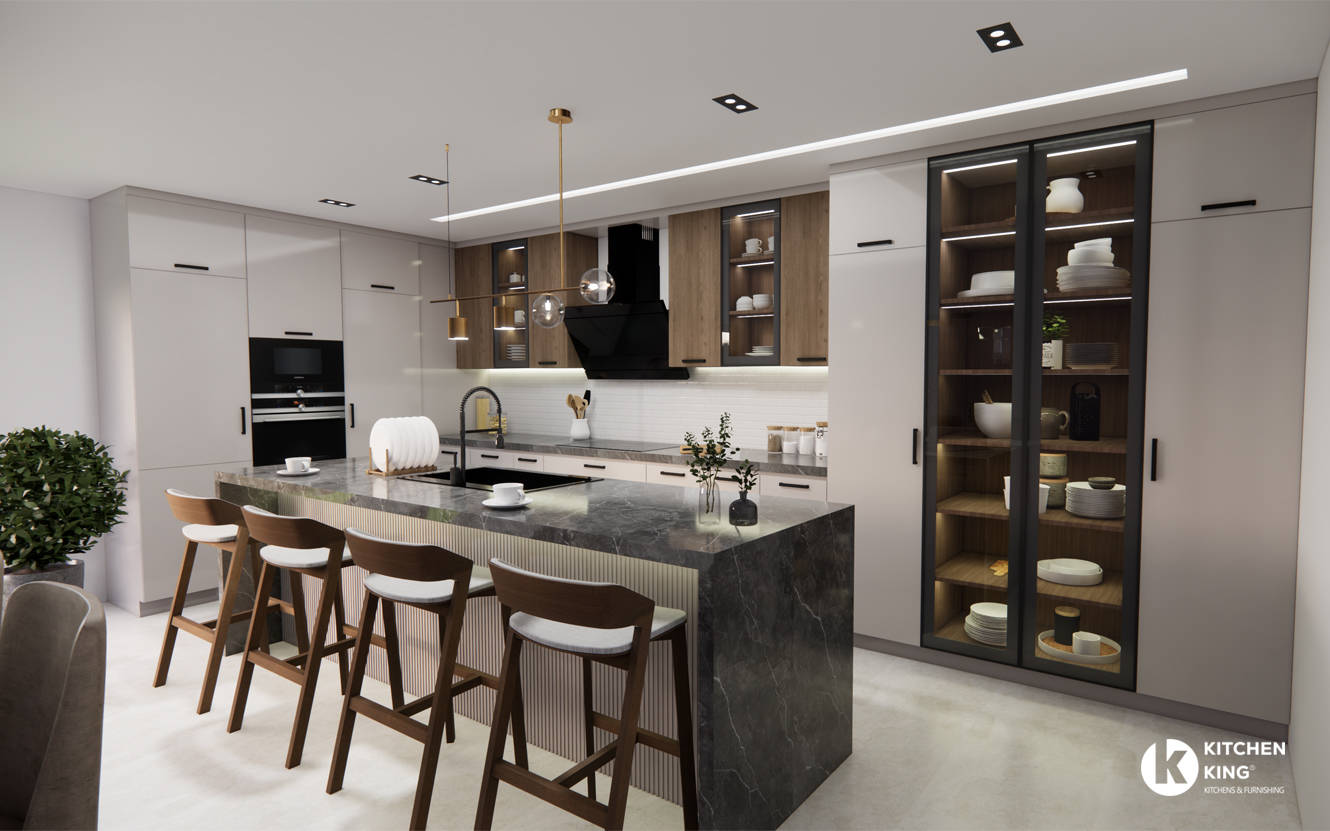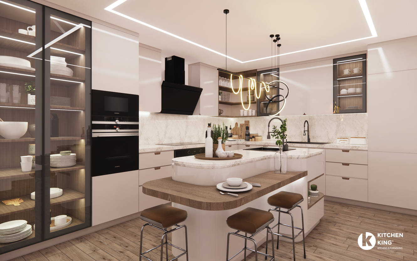 Minimalist Kitchen design by Kitchen King. Featuring sleek wood cabinetry, a pristine waterfall island, and a cozy built-in breakfast nook, this space blends luxury with functionality. Perfect for villas and high-end apartments in Dubai looking for clean, contemporary interiors.